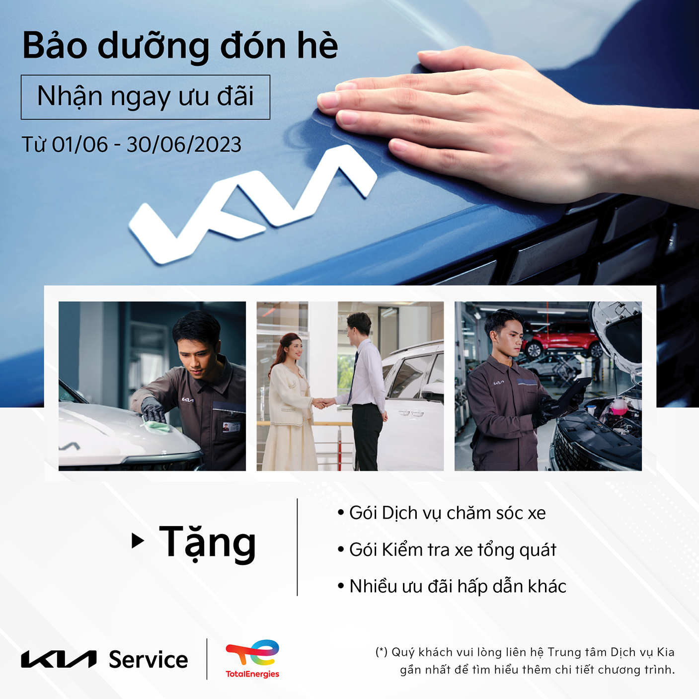 Với triết lý “Tận tâm phục vụ”, Kia Việt Nam luôn cố gắng mang đến những giá trị thiết thực dành cho Khách hàng. Vì vậy, trong tháng 6 này, Kia Việt Nam triển khai chương trình “BẢO DƯỠNG ĐÓN HÈ, NHẬN NGAY ƯU ĐÃI” với những đặc quyền khi sử dụng dịch vụ tại Trung tâm dịch vụ chính hãng Kia Việt Nam.